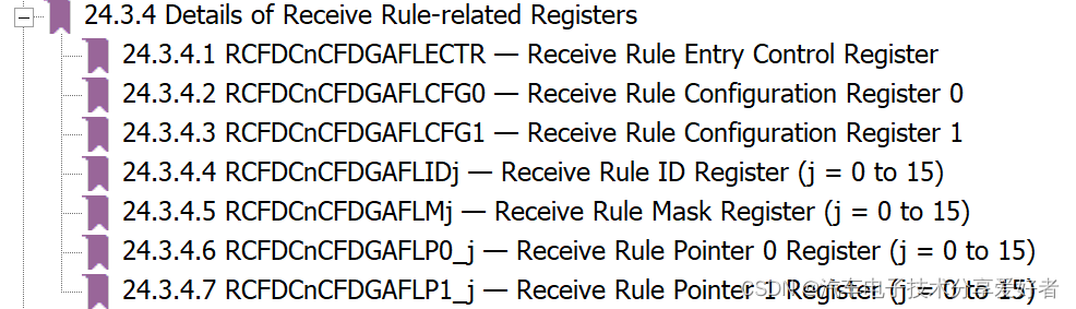 RS-CANFD接收滤波基于接收规则表,控制和配置功能主要涉及7类寄存器: