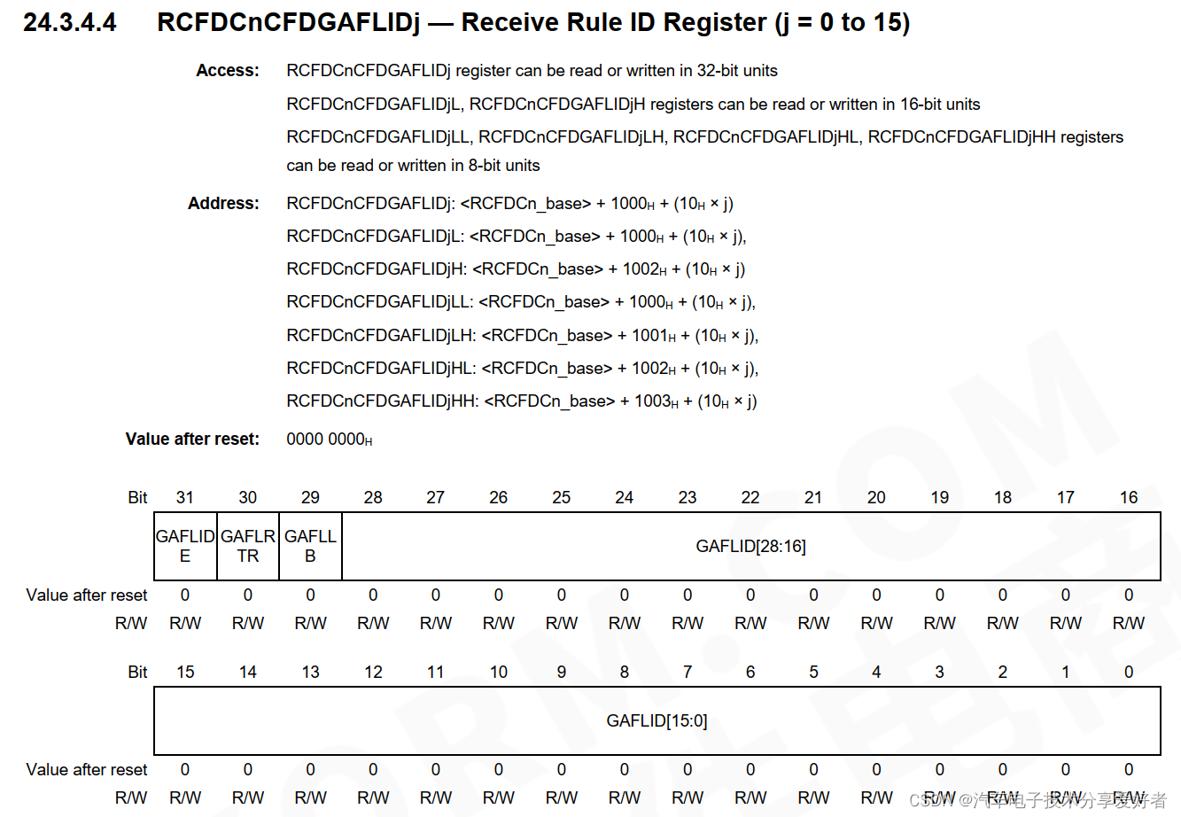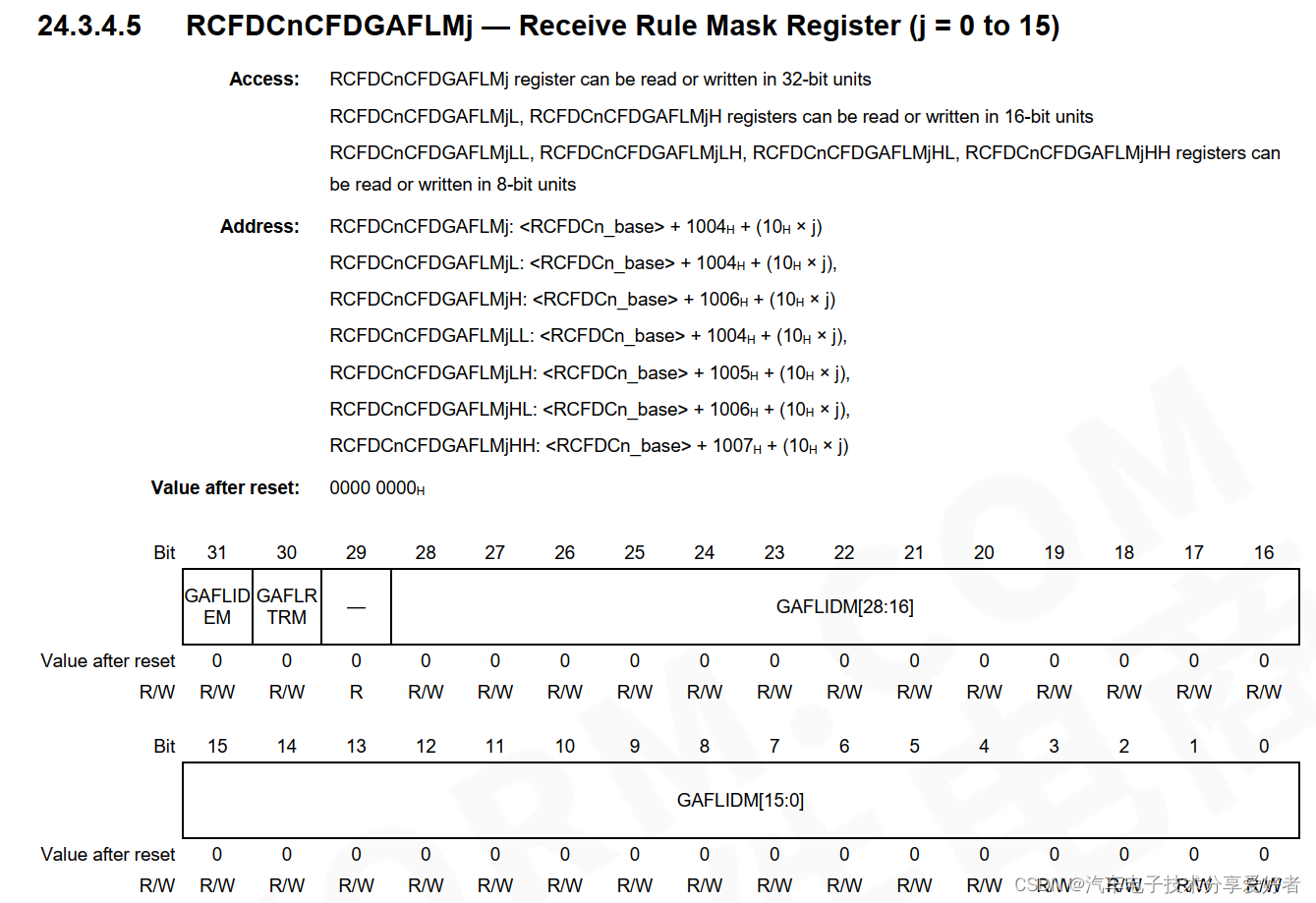 Each receive rule consists of 16 bytes in the RCFDCnCFDGAFLIDj, RCFDCnCFDGAFLMj,