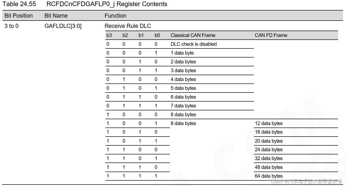 【重要*】BitGAFLDLCA[3:0]:是否使能DLC检查,即RSCAN提供了报文DLC检查机制,如下图。如果采用软件DLC滤波,该4位设置为0。