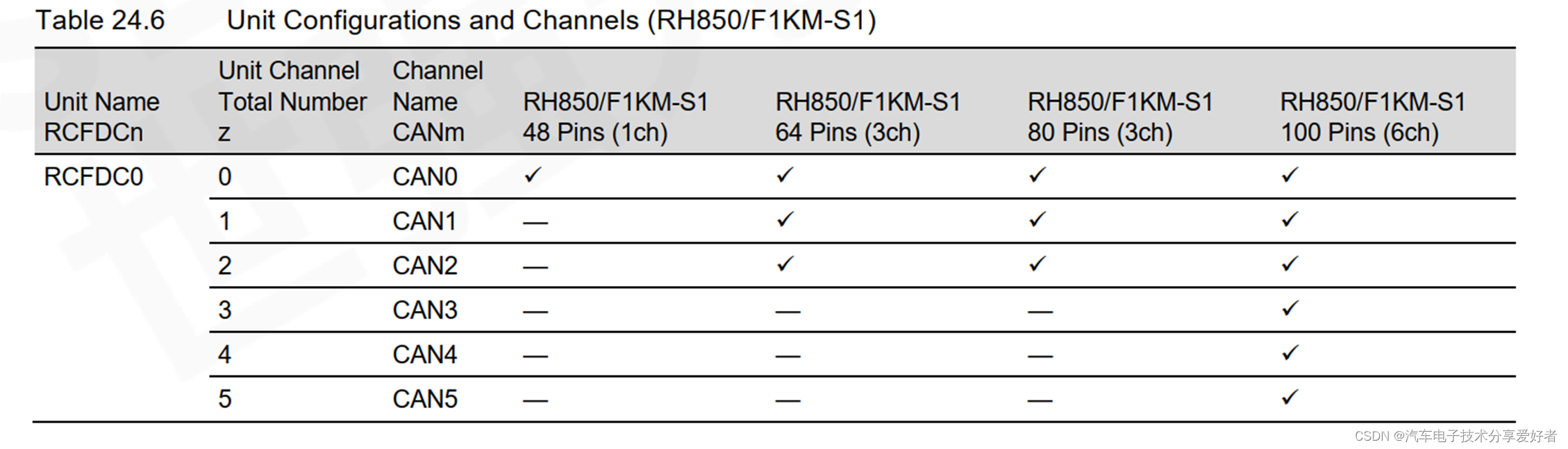 不同PIN封装形式所支持的CAN通道数量不同,RS-CAN通道数量最多可支持6路。