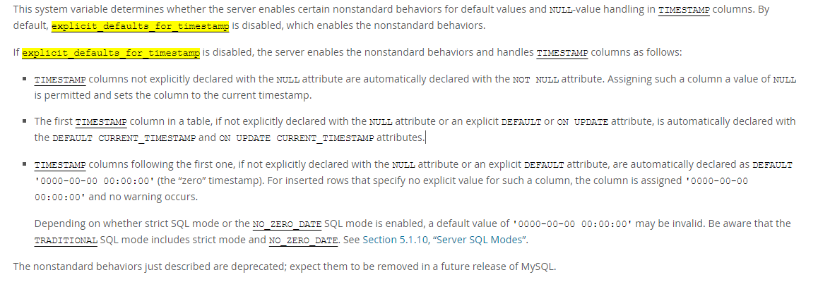 这个值默认是false,这个时候插入null,会自动转换为 DEFAULT CURRENT_TIMESTAMP and ON UPDATE CURRENT_TIMESTAMP