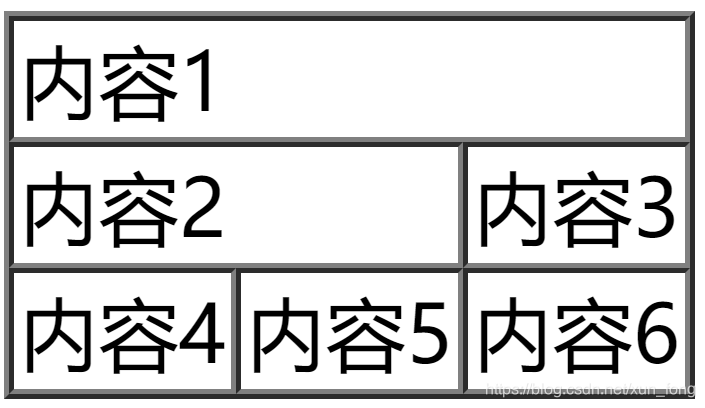 <table border="1" cellspacing="0"><tr><td colspan="3">内容1</td></tr><tr><td colspan="2">内容2</td><td>内容3</td></tr><tr><td>内容4</td><td>内容5</td><td>内容6</td></tr></table>