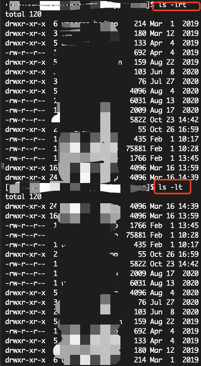 综上:ls -lrt 命令表示按修改时间倒序输出,最新修改的文件会排在下面(没有加 -r 的时候排在上面)。示例如下图: