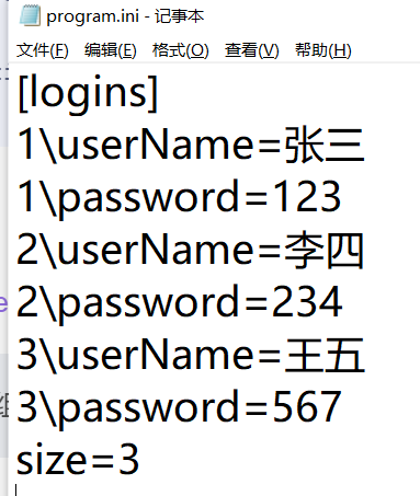 {QSettings settings("program.ini", QSettings::IniFormat);struct Login{Login(QString userName,QString password){this->userName = userName;this->password = password;}QString userName;QString password;};QList<Login> list;list << Login("张三","123") << Login("李四","234") << Login("王五","567");settings.beginWriteArray("logins");for (int i = 0; i < list.size(); ++i){settings.setArrayIndex(i);settings.setValue("userName", list.at(i).userName);settings.setValue("password", list.at(i).password);}settings.endArray();
