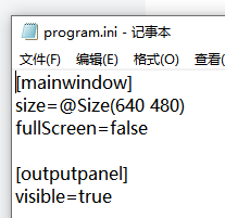 QSettings settings("program.ini", QSettings::IniFormat);settings.setValue("mainwindow/size", w.size());settings.setValue("mainwindow/fullScreen", w.isFullScreen());settings.setValue("outputpanel/visible", w.isVisible());