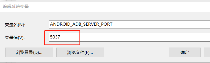 正常的应该和上面一样,但我在cmd里面执行命令只有adb的正常显示出版本,nox_adb显示没有此命令之类的,后面我就思考到我没有在高级系统设置环境变量的Path里没有给出nox_adb的路径,会不会是因为这个才找不到它,后来我就在Path中加上nox_adb的路径,并且我发现系统好像自定义了Android的接口为55,而不是5037,我又把接口改为5037,如图所示: