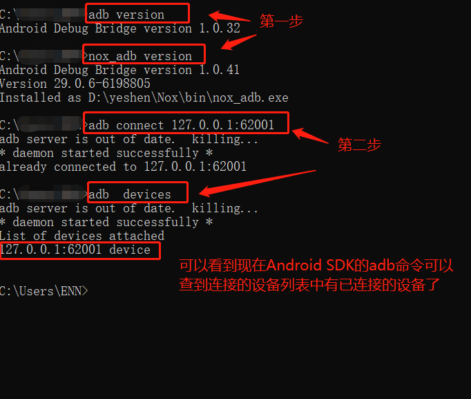 第二种Android SDK的adb版本和夜神模拟器bin目录下的adb.exe和nox_adb.exe版本不一样,这个一开始我就有替换到。但是依然报错,非常的苦恼,终于找到了解决方法,中间有看到另外一份作者的,对她的进行了一些补充才解决了这个问题,后面我会著名是哪位作者,整个正确过程如下: