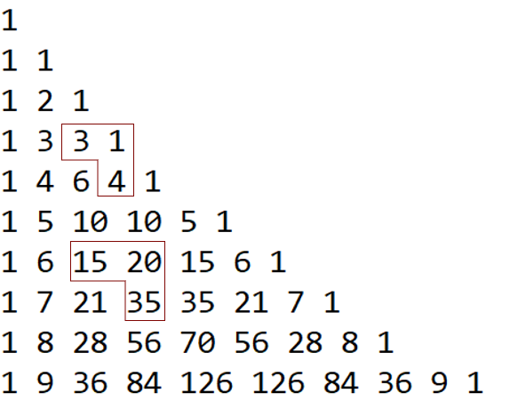 杨辉三角的规律是每行数字的第一列和最后一列的数字都是1,从第三行开始,除去第一列和最后一列都为数字1以外,其余每列的数字都等于它上方两个数字之和。例如下面图片中7字形圈起来的:4 = 3 + 1、35 = 15 +20。