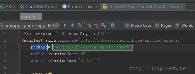 在还没有从eclipse转到Android Studio开发的时候,我们都知道一个项目的包名定义在AndroidManifest文件中的package,如下图: