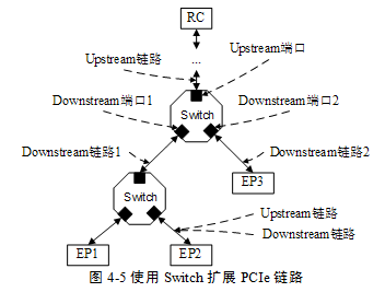 PCIe链路使用端到端的数据传送方式。在一条PCIe链路中,这两个端口是完全对等的,分别连接发送与接收设备,而且一个PCIe链路的一端只能连接一个发送设备或者接收设备。因此PCIe链路必须使用Switch扩展PCIe链路后,才能连接多个设备。使用Switch进行链路扩展的实例如图4‑5所示。