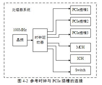在一个处理器系统中,通常采用专用逻辑向PCIe插槽提供REFCLK+和REFCLK-信号,如图4\‑2所示。其中100Mhz的时钟源由晶振提供,并经过一个“一推多”的差分时钟驱动器生成多个同相位的时钟源,与PCIe插槽一一对应连接。
