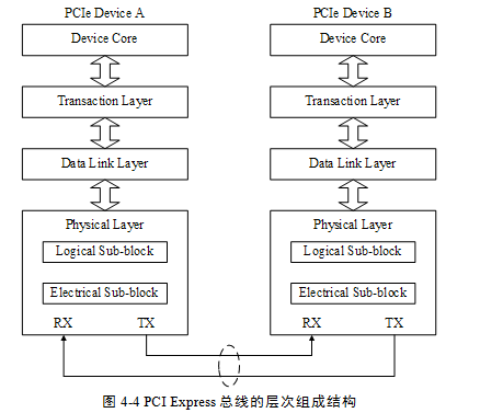 PCIe链路使用“端到端的数据传送方式”,发送端和接收端中都含有TX(发送逻辑)和RX(接收逻辑),其结构如图4‑1所示。