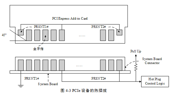 如图4\‑3所示,PRSNT1#和PRSNT2#信号使用的金手指长度是其他信号的一半。因此当PCIe设备插入插槽时,PRSNT1#和PRSNT2#信号在其他金手指与PCIe插槽完全接触,并经过一段延时后,才能与插槽完全接触;当PCIe设备从PCIe插槽中拔出时,这两个信号首先与PCIe插槽断连,再经过一段延时后,其他信号才能与插槽断连。系统软件可以使用这段延时,进行一些热拔插处理。