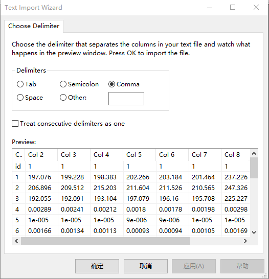 (2)因使用csv文件,Delimiters中选择Comma,点击确定