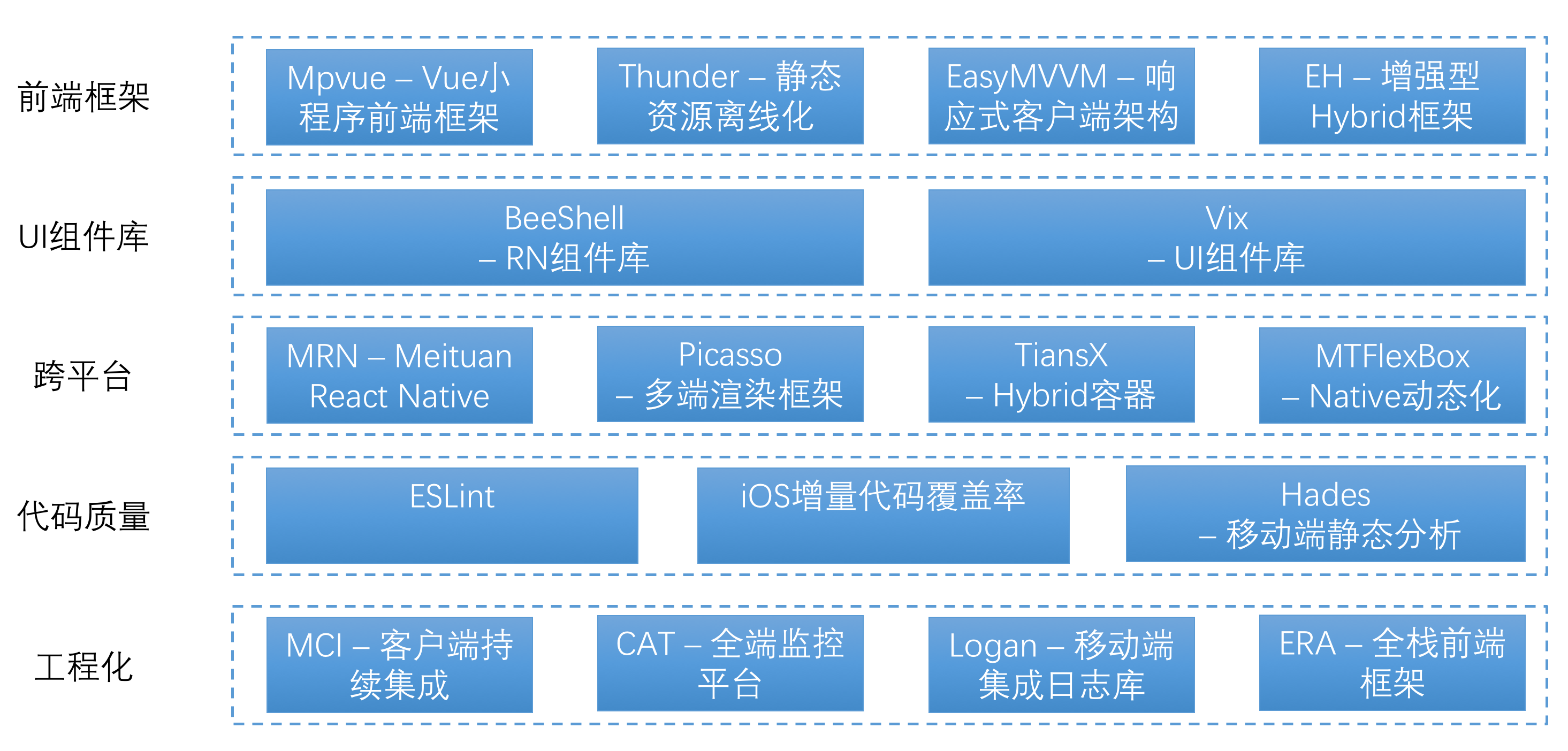 美团点评在多业务、多容器、多端上都有非常丰富的业务场景,于是在大前端领域沉淀了众多的解决方案和框架。上图是根据现有公开资料整理而成的技术全景图,大体上能够体现在大前端方面的积累,当然这可能仅仅是公司现有能力的冰山一角。