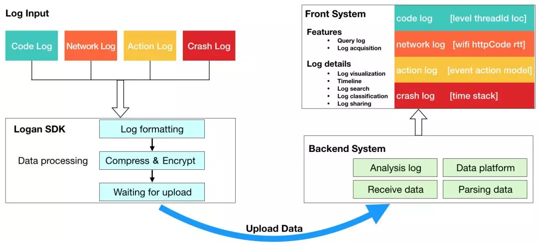 - 后端系统:后端是接收和处理数据中心,相当于Logan的大脑。主要有四个功能:接收日志、日志解析归档、日志分析、数据平台。
