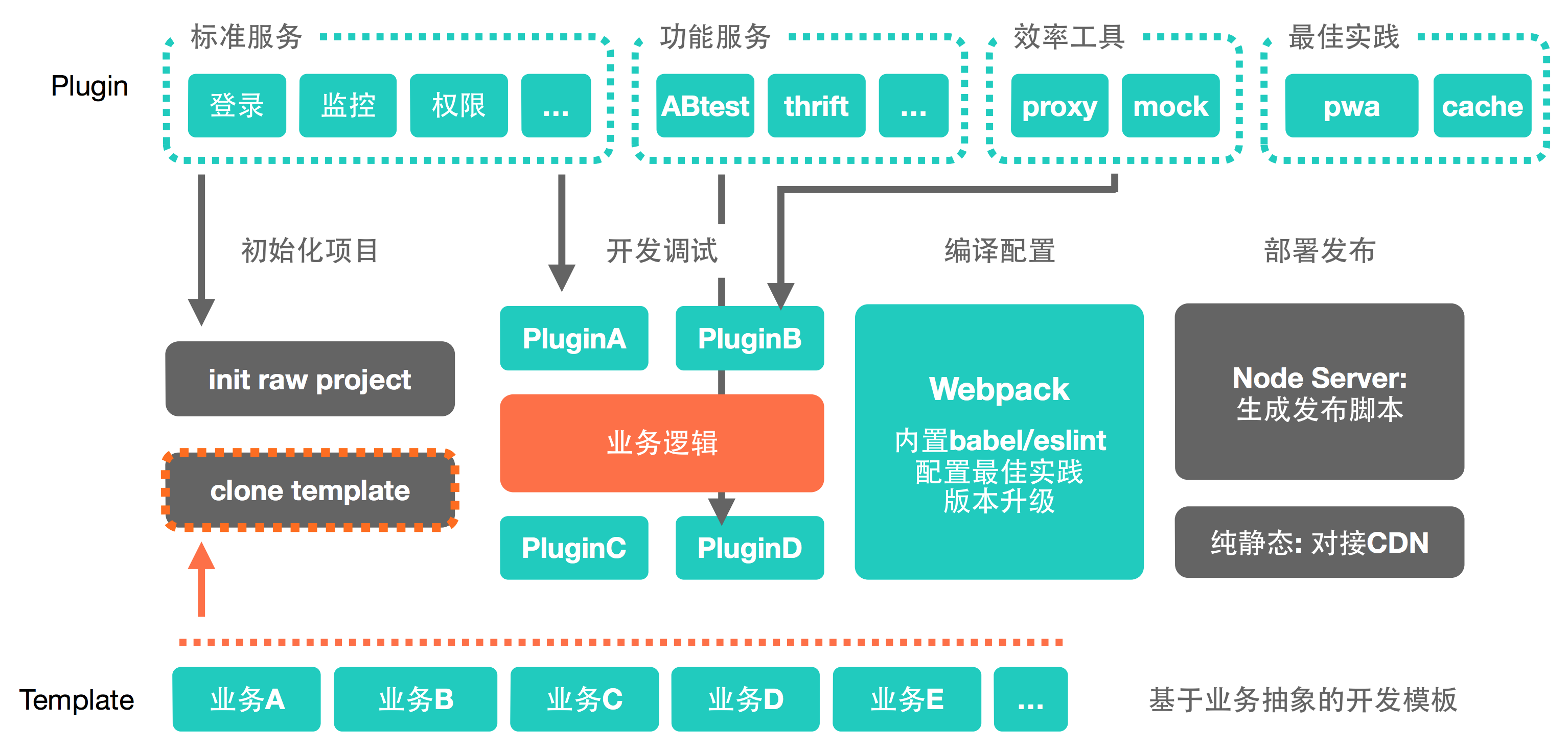 - 开发调试:基于插件方式可以快速集成各类服务,例如ABTest、Proxy、Mock、PWA等等,可以帮助业务开发同学快速进行业务逻辑代码编写