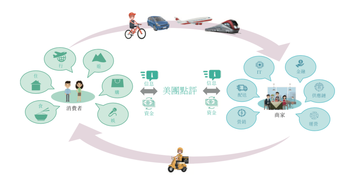 美团点评是一个连接消费者和商家的本地生活平台,在C端涵盖食、住、行、游、购、娱等众多本地生活服务,在B端也不断深入,具备营销、配送、IT、金融、供应链和运营等能力。