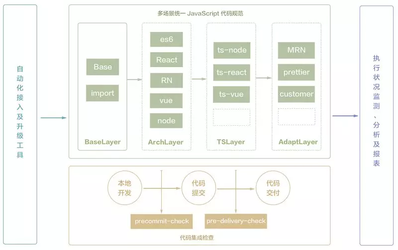 多场景统一的 JavaScript 规范:该模块是整个方案的核心,借助 ESLint 的特性,通过分层分类的结构设计,在保证基础规则一致性的同时,实现了对不同场景、技术选型的支撑。