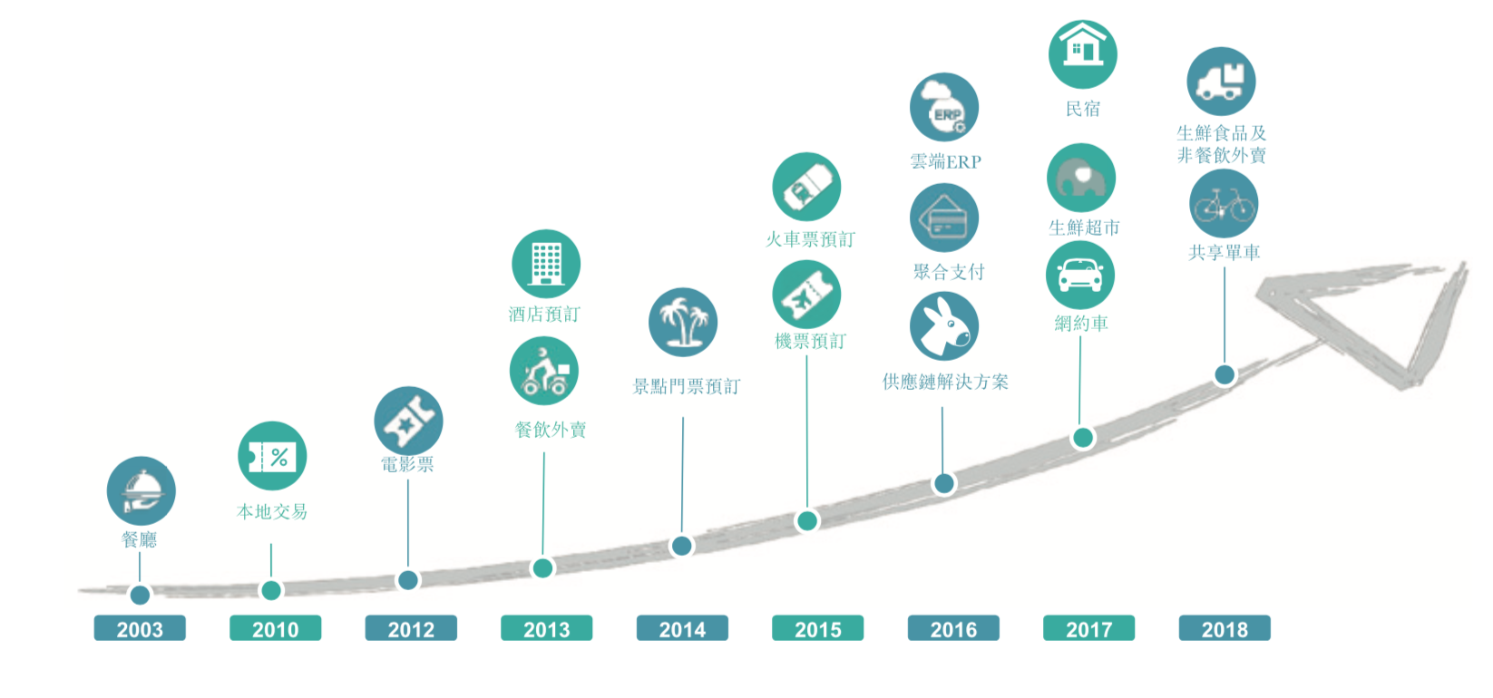 美团点评基于餐厅的本地点评和团购业务开始,每年不断扩展新的业务,丰富业务品类增强用户粘度,逐步成长为一个本地生活服务的超级平台。