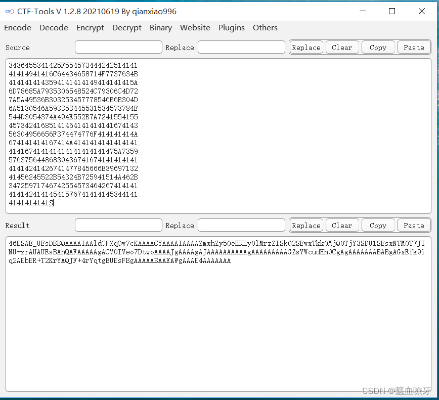 3.查看解码过的内容,开头有46ESAB_,推测是base64加密,使用在线工具解码得到:
