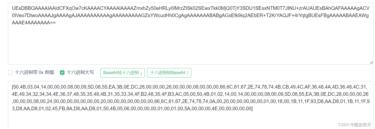 查看解码内容,有PK,flag.txt——>推测是文件夹或者压缩包