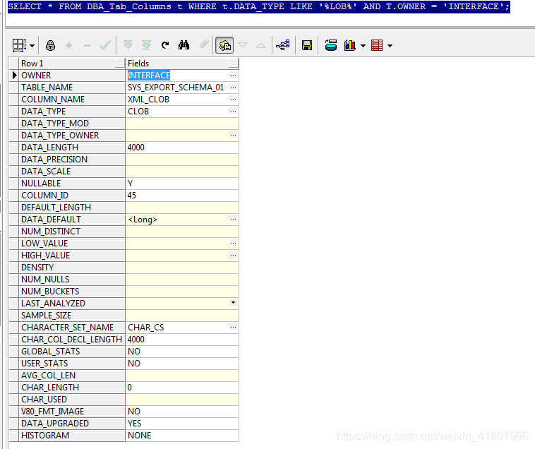 SELECT * FROM DBA_Tab_Columns t WHERE t.DATA_TYPE LIKE '%LOB%' AND T.OWNER = 'INTERFACE';