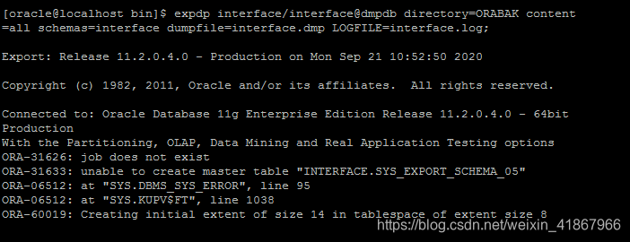 如果导出用户的默认表空间对应的initial_extent <= 14 个block 就会报错。