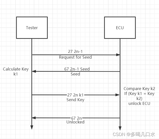 在解锁之前,先向我们的ECU请求一个种子,所以用27服务和2n-1(相当于是奇数),让n=1,这时候27 01对ECU进行了请求解锁,这时候ECU给我们一个肯定的响应,就回了一个67服务和2n-1,就是67 01后面再跟一段字符,就是我们的种子。当我们的测试端拿到种子的时候,进行运算(由整车厂进行规定),利用这个算法,生成钥匙K1,然后再通过27 2n K1,就是 27 02 K1,把这条请求发送给ECU,ECU拿到K1进行运算,计算出K2,当K1和K2匹配的时候,ECU就可以解锁了。解锁以后ECU向测试端发出肯定响应67 02。
