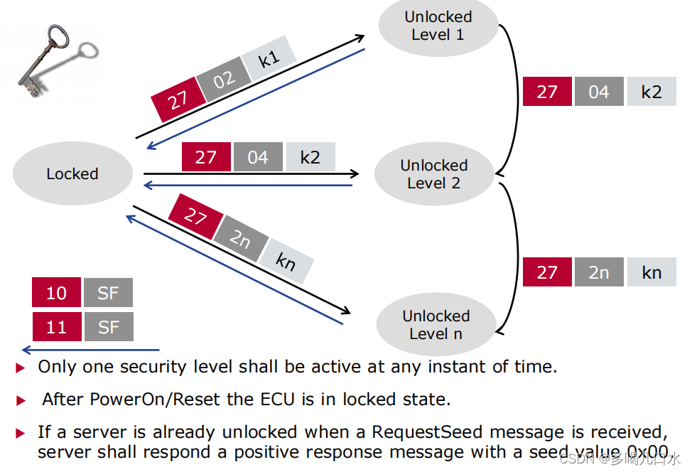 平常读写只需要用到22服务+DID,有一些数据需要加密,在ECU上电以后,是一个锁定的状态,我们通过27+子服务+密钥,通过这样的服务请求来进行一个解锁状态。解锁之后ECU状态就变成了Unlocked状态,Unlocked状态整车厂可以设置不同的级别。各个级别之间没有制约关系。是可以互相转换的。