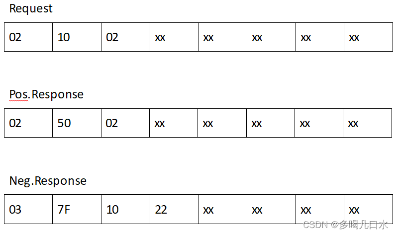 在CAN总线当中每一个帧的报文每一条请求都只支持8个字节。第一个02代表TP层的一个单帧,2代表后面有两个有效字节。在Request里面,后面5个字节对我们来说是没有意义的。肯定响应也一样,三个字节加5个填充位。最后否定响应,有四个字节7F+SID+否定响应的代码NRC。22表示当前的状态。