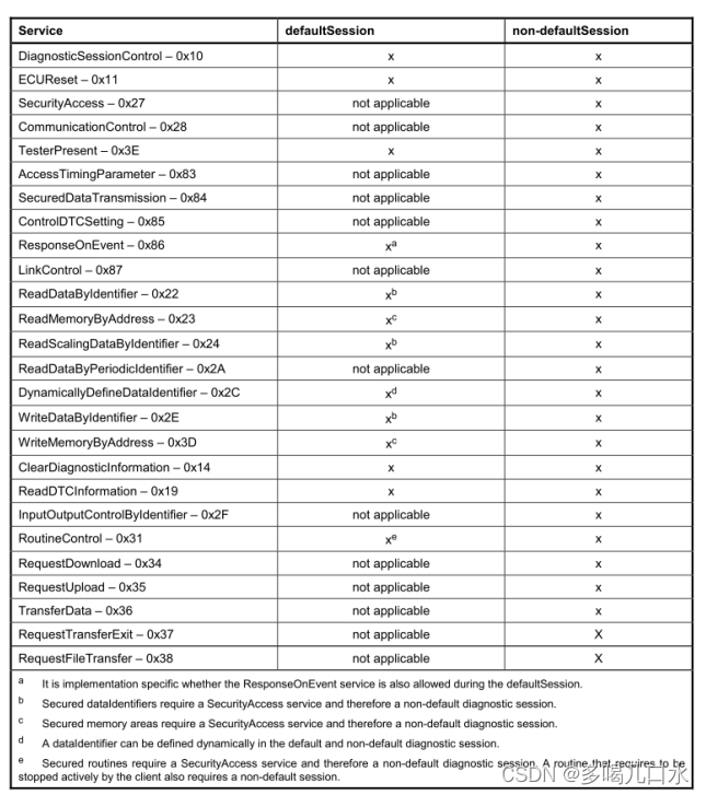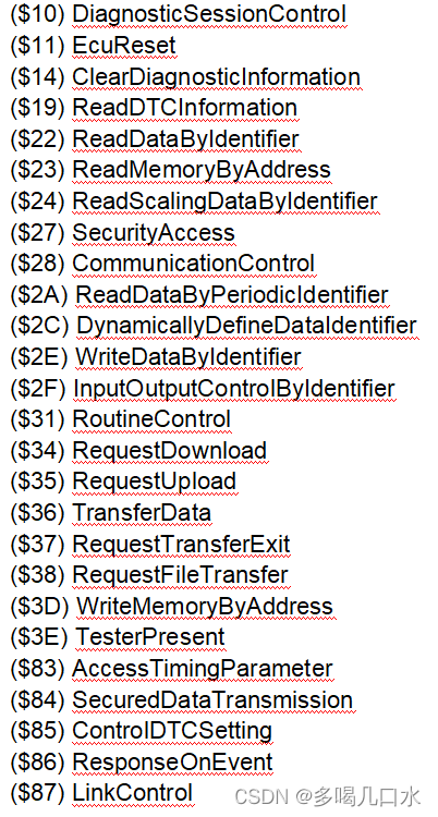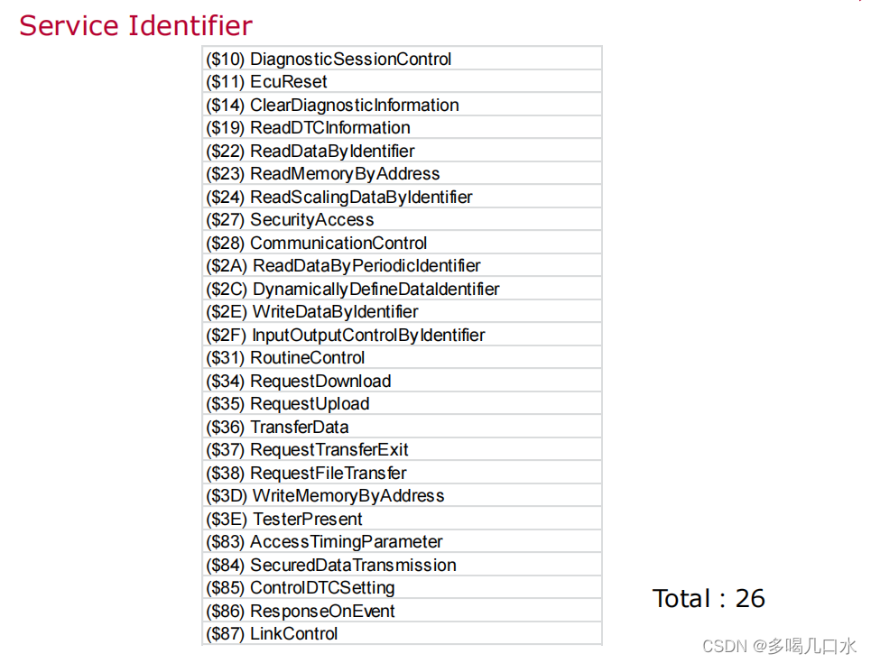 在UDS里面定义的服务有26种,每一个服务发出请求的格式是不一样的。但是每一个服务都带有格式标识符(SID)。