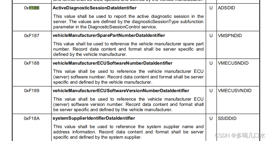 DID有一部分已经被UDS规定了,可以在14229-1里面找到。这是5个相关DID,可以使用可以不使用