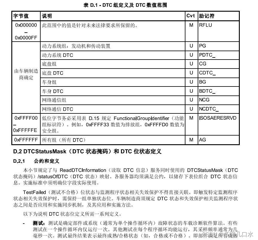 02服务,通过DTC的状态掩码来读,DTC状态掩码:这里面有8个字节,每一位都代表着不同的状态。从0到7,具体定义看14229附录4中的具体定义。DTC的状态有专门的一个字节来表示。