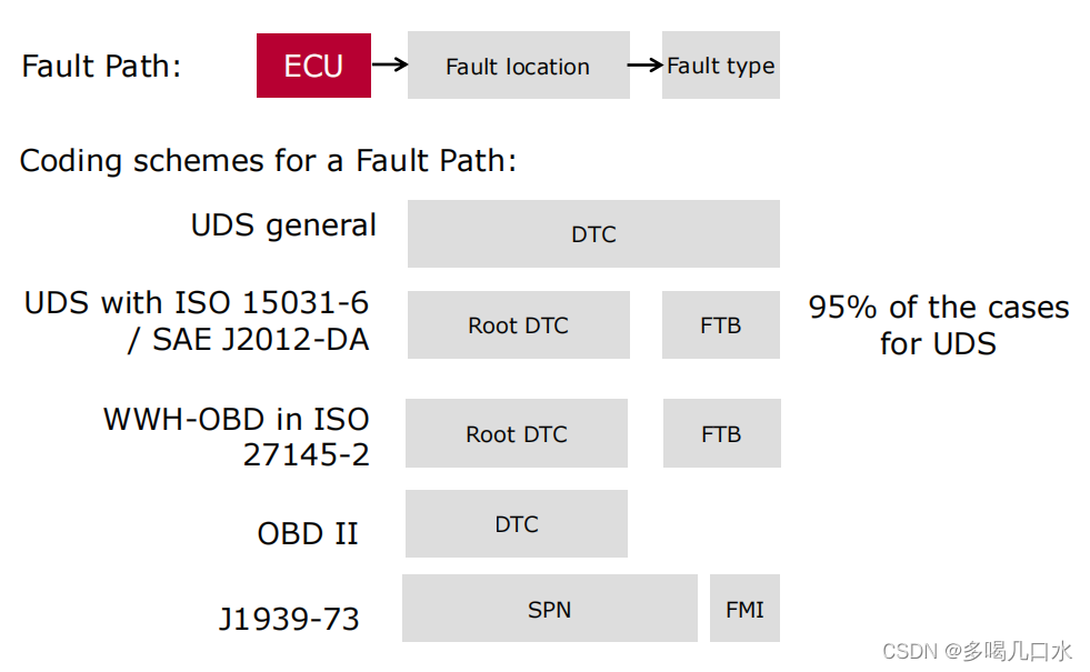 在UDS种规定以3个字节的长度作为一个DTC,一般来说都会使用15031-6里面的规范来规定3个字节所代表的不同的含义。前两个字节可以代表一个根DTC,最后一个字节是一个DTC状态的位。FTB就是错误类型的Bit,fault tape bit, 在H-OBD和OBD II中都有不同的DTC的格式。在商用车J1939当中也不太一样。