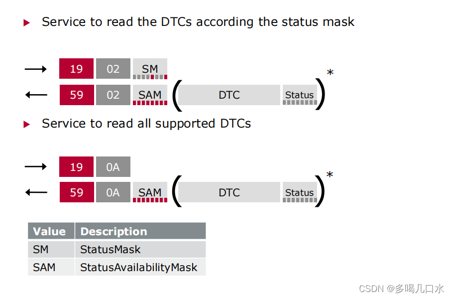 当我们请求DTC的时候,我们就用19 02 故障状态掩码(SM),肯定响应的时候也是要有一个状态掩码SAM,在每一个DTC当中,不光只有三个字节的本身DTC代表的一个CODE, 最后一个位还会有一个DTC的状态。这个是当产生和记录的时候这个位就已经被创建好了。19 0A也一样,响应的时候响应59 0A。