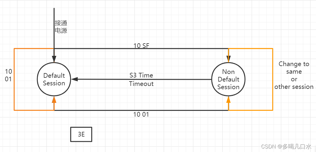 当ECU上电的时候,进入的是默认会话Default Session(10 01),如果想跳转到非默认会话,也就是02或者03,就需要用10+子服务(SF),里面有一个S3计时器,如果在S3的时间没有任何请求发出来的话,我们会自动的回到默认会话,相当于保护机制。还有一个重要的服务,3E服务,就是保持在当前会话的服务,因为我们在非默认会话的时候,不可能一直发出请求。当我们停下来做数据分析或者其它动作的时候ECU没有发出有效命令的时候,我们可以用到3E,3E就是在S3计时时间到之前,我们发出一个3E服务,这样就会一直保持在非默认会话的情况。