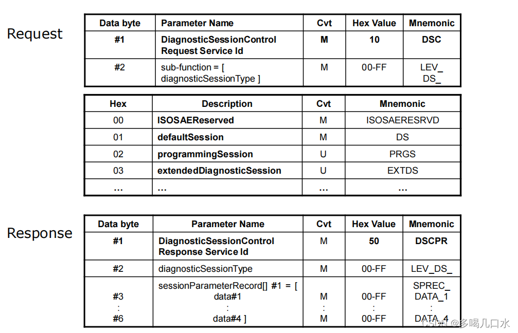 在Cvt列,M代表强制,强制使用10和子服务。在UDS SF当中定义了00到03,其中00是不会被使用的。01到03代表不同的含义。Response对应的相应,对应的肯定响应是在SID上加上40,10+40=50,S也代表强制使用,在这里面代表如果我们的肯定相应没有被抑制的话,这个字节就是要被强制使用的。后面我们的服务也是被强制使用的。后面C是有条件使用的。由客户决定。