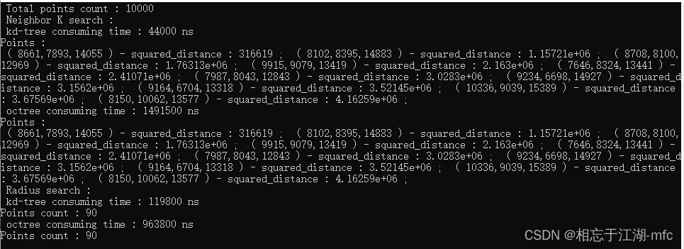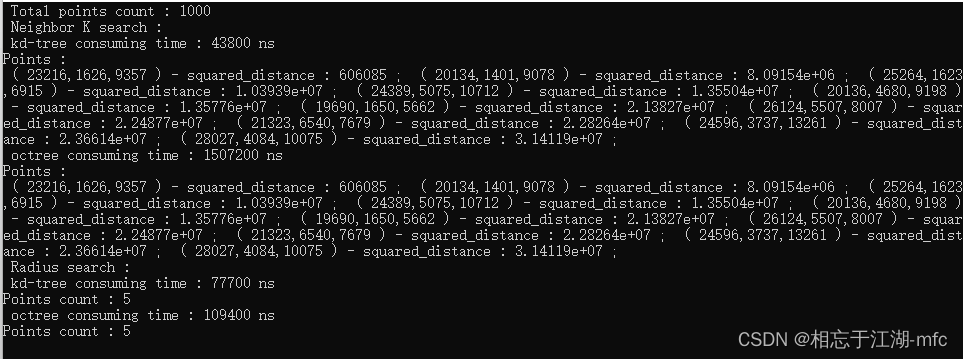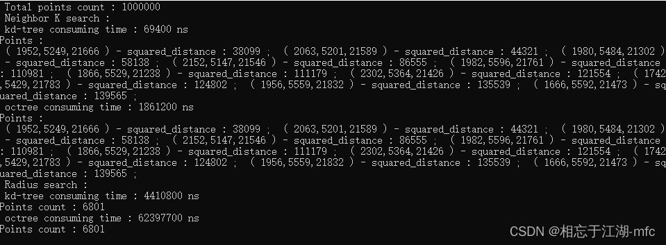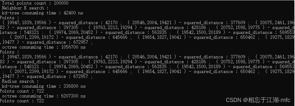 {QCoreApplication a(argc, argv);//创建1000个点的点云(取值范围为1~RAND_MAX)pcl::PointCloud<pcl::PointXYZ>::Ptr clound(new pcl::PointCloud<pcl::PointXYZ>());clound->width = 1000;//10000//100000//1000000clound->height = 1;clound->resize(clound->width *clound->height);for(int i = 0; i < clound->points.size(); ++i){clound->points[i].x = rand();clound->points[i].y = rand();clound->points[i].z = rand();}//kd-treepcl::KdTreeFLANN<pcl::PointXYZ> kdtree;kdtree.setInputCloud(clound);//八叉树float octreeResolution_arg = 1.0f; //体素棱长为1pcl::octree::OctreePointCloudSearch<pcl::PointXYZ> octree(octreeResolution_arg);octree.setInputCloud(clound);octree.addPointsFromInputCloud();//查找点pcl::PointXYZ search_pt;search_pt.x = rand();search_pt.y = rand();search_pt.z = rand();std::vector<int> pt_index;std::vector<float> pt_sqart_dis;std::cout << " Total points count : " << clound->points.size() << std::endl;//K邻域搜索std::cout << " Neighbor K search : " << std::endl;pt_index.clear();pt_sqart_dis.clear();int K = 10;std::chrono::system_clock::time_point start = std::chrono::system_clock::now();kdtree.nearestKSearch(search_pt, K, pt_index, pt_sqart_dis);std::chrono::system_clock::time_point end = std::chrono::system_clock::now();auto nao_time = std::chrono::duration_cast<std::chrono::nanoseconds>(end - start);std::cout << " kd-tree consuming time : " << nao_time.count() << " ns " << std::endl;std::cout << "Points :" << std::endl;for(int i = 0; i < pt_index.size(); ++i){int pti = pt_index[i];float sd = pt_sqart_dis[i];std::cout << " ( " << clound->points[pti].x << "," << clound->points[pti].y << "," << clound->points[pti].z << " ) "<< "- squared_distance : " << sd << " ; ";}std::cout << std::endl;pt_index.clear();pt_sqart_dis.clear();K = 10;start = std::chrono::system_clock::now();octree.nearestKSearch(search_pt, K, pt_index, pt_sqart_dis);end = std::chrono::system_clock::now();nao_time = std::chrono::duration_cast<std::chrono::nanoseconds>(end - start);std::cout << " octree consuming time : " << nao_time.count() << " ns " << std::endl;std::cout << "Points :" << std::endl;for(int i = 0; i < pt_index.size(); ++i){int pti = pt_index[i];float sd = pt_sqart_dis[i];std::cout << " ( " << clound->points[pti].x << "," << clound->points[pti].y << "," << clound->points[pti].z << " ) "<< "- squared_distance : " << sd << " ; ";}std::cout << std::endl;//半径搜索std::cout << " Radius search : " << std::endl;pt_index.clear();pt_sqart_dis.clear();float radius = 0x1000;start = std::chrono::system_clock::now();kdtree.radiusSearch(search_pt, radius, pt_index, pt_sqart_dis);end = std::chrono::system_clock::now();nao_time = std::chrono::duration_cast<std::chrono::nanoseconds>(end - start);std::cout << " kd-tree consuming time : " << nao_time.count() << " ns " << std::endl;std::cout << "Points count : " << pt_index.size() << std::endl;/*for(int i = 0; i < pt_index.size(); ++i){int pti = pt_index[i];float sd = pt_sqart_dis[i];std::cout << " ( " << clound->points[pti].x << "," << clound->points[pti].y << "," << clound->points[pti].z << " ) "<< "- squared_distance : " << sd << " ; ";}std::cout << std::endl;*/pt_index.clear();pt_sqart_dis.clear();radius = 0x1000;start = std::chrono::system_clock::now();octree.radiusSearch(search_pt,radius, pt_index, pt_sqart_dis);end = std::chrono::system_clock::now();nao_time = std::chrono::duration_cast<std::chrono::nanoseconds>(end - start);std::cout << " octree consuming time : " << nao_time.count() << " ns " << std::endl;std::cout << "Points count : " << pt_index.size() << std::endl;/*for(int i = 0; i < pt_index.size(); ++i){int pti = pt_index[i];float sd = pt_sqart_dis[i];std::cout << " ( " << clound->points[pti].x << "," << clound->points[pti].y << "," << clound->points[pti].z << " ) "<< "- squared_distance : " << sd << " ; ";}std::cout << std::endl;*/return a.exec();