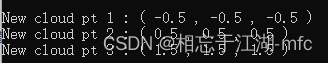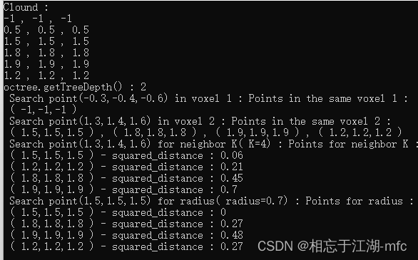 {QCoreApplication a(argc, argv);//创建6个点的点云pcl::PointCloud<pcl::PointXYZ>::Ptr clound(new pcl::PointCloud<pcl::PointXYZ>());clound->width = 6;clound->height = 1;clound->resize(clound->width *clound->height);int index = 0;clound->points[index].x = -1;clound->points[index].y = -1;clound->points[index].z = -1;index = 1;clound->points[index].x = 0.5;clound->points[index].y = 0.5;clound->points[index].z = 0.5;index = 2;clound->points[index].x = 1.5;clound->points[index].y = 1.5;clound->points[index].z = 1.5;index = 3;clound->points[index].x = 1.8;clound->points[index].y = 1.8;clound->points[index].z = 1.8;index = 4;clound->points[index].x = 1.9;clound->points[index].y = 1.9;clound->points[index].z = 1.9;index = 5;clound->points[index].x = 1.2;clound->points[index].y = 1.2;clound->points[index].z = 1.2;//打印点云qDebug() << "Clound : ";for(int i = 0; i < clound->points.size(); ++i){qDebug() << clound->points[i].x << "," << clound->points[i].y << "," << clound->points[i].z;}//创建八叉树对象,并将点云对象赋值给它float octreeResolution_arg = 1.0f; //体素棱长为1pcl::octree::OctreePointCloudSearch<pcl::PointXYZ> octree(octreeResolution_arg);octree.setInputCloud(clound);octree.addPointsFromInputCloud();//构建八叉树int octee_depth = octree.getTreeDepth();std::cout << "octree.getTreeDepth() : " << octee_depth << std::endl;//输出八叉树深度//体素近邻搜索pcl::PointXYZ search_pt_for_neighbor_in_voxel;search_pt_for_neighbor_in_voxel.x = -0.3;search_pt_for_neighbor_in_voxel.y = -0.4;search_pt_for_neighbor_in_voxel.z = -0.6;std::cout << " Search point(" << search_pt_for_neighbor_in_voxel.x << "," << search_pt_for_neighbor_in_voxel.y << "," << search_pt_for_neighbor_in_voxel.z << ") in voxel 1 : ";std::vector<int> pt_index_for_neighbor_in_voxel;if(octree.voxelSearch(search_pt_for_neighbor_in_voxel, pt_index_for_neighbor_in_voxel)){std::cout << "Points in the same voxel 1 :" << std::endl;for(int i = 0; i < pt_index_for_neighbor_in_voxel.size(); ++i){int pt_index = pt_index_for_neighbor_in_voxel[i];if(i > 0)std::cout << ",";std::cout << " ( " << clound->points[pt_index].x << "," << clound->points[pt_index].y << "," << clound->points[pt_index].z << " ) ";}std::cout << std::endl;}elsestd::cout << "None point in the same voxel 1 ." << std::endl;search_pt_for_neighbor_in_voxel.x = 1.3;search_pt_for_neighbor_in_voxel.y = 1.4;search_pt_for_neighbor_in_voxel.z = 1.6;pt_index_for_neighbor_in_voxel.clear();std::cout << " Search point(" << search_pt_for_neighbor_in_voxel.x << "," << search_pt_for_neighbor_in_voxel.y << "," << search_pt_for_neighbor_in_voxel.z << ") in voxel 2 : ";if(octree.voxelSearch(search_pt_for_neighbor_in_voxel, pt_index_for_neighbor_in_voxel)){std::cout << "Points in the same voxel 2 :" << std::endl;for(int i = 0; i < pt_index_for_neighbor_in_voxel.size(); ++i){int pt_index = pt_index_for_neighbor_in_voxel[i];if(i > 0)std::cout << ",";std::cout << " ( " << clound->points[pt_index].x << "," << clound->points[pt_index].y << "," << clound->points[pt_index].z << " ) ";}std::cout << std::endl;}elsestd::cout << "None point in the same voxel 2 ." << std::endl;//k近邻搜索int K = 4;//最近的4个点pcl::PointXYZ search_pt_for_neighbor_k;search_pt_for_neighbor_k.x = 1.3;search_pt_for_neighbor_k.y = 1.4;search_pt_for_neighbor_k.z = 1.6;std::vector<int> pt_index_for_neighbor_k;std::vector<float> squared_distance_for_neighbor_k;std::cout << " Search point(" << search_pt_for_neighbor_k.x << "," << search_pt_for_neighbor_k.y << "," << search_pt_for_neighbor_k.z << ") for neighbor K( K=" << K << ") : ";if(octree.nearestKSearch(search_pt_for_neighbor_k, K, pt_index_for_neighbor_k, squared_distance_for_neighbor_k)){std::cout << "Points for neighbor K :" << std::endl;for(int i = 0; i < pt_index_for_neighbor_k.size(); ++i){int pt_index = pt_index_for_neighbor_k[i];float sd = squared_distance_for_neighbor_k[i];std::cout << " ( " << clound->points[pt_index].x << "," << clound->points[pt_index].y << "," << clound->points[pt_index].z << " ) "<< "- squared_distance : " << sd << " " << std::endl;}}elsestd::cout << "None point for neighbor K ." << std::endl;//半径近邻搜索double raius = 0.7;//距离为 (radius ^ 2) > (3 * (1.9 - 1.5) ^ 2),保证体素内4个点都在距离范围内pcl::PointXYZ search_pt_for_radius;search_pt_for_radius.x = 1.5;search_pt_for_radius.y = 1.5;search_pt_for_radius.z = 1.5;std::vector<int> pt_index_for_radius;std::vector<float> squared_distance_for_radius;std::cout << " Search point(" << search_pt_for_radius.x << "," << search_pt_for_radius.y << "," << search_pt_for_radius.z << ") for radius( radius=" << raius << ") : ";if(octree.radiusSearch(search_pt_for_radius, raius, pt_index_for_radius, squared_distance_for_radius)){std::cout << "Points for radius :" << std::endl;for(int i = 0; i < pt_index_for_radius.size(); ++i){int pt_index = pt_index_for_radius[i];float sd = squared_distance_for_radius[i];std::cout << " ( " << clound->points[pt_index].x << "," << clound->points[pt_index].y << "," << clound->points[pt_index].z << " ) "<< "- squared_distance : " << sd << " " << std::endl;}}elsestd::cout << "None point for radius ." << std::endl;return a.exec();