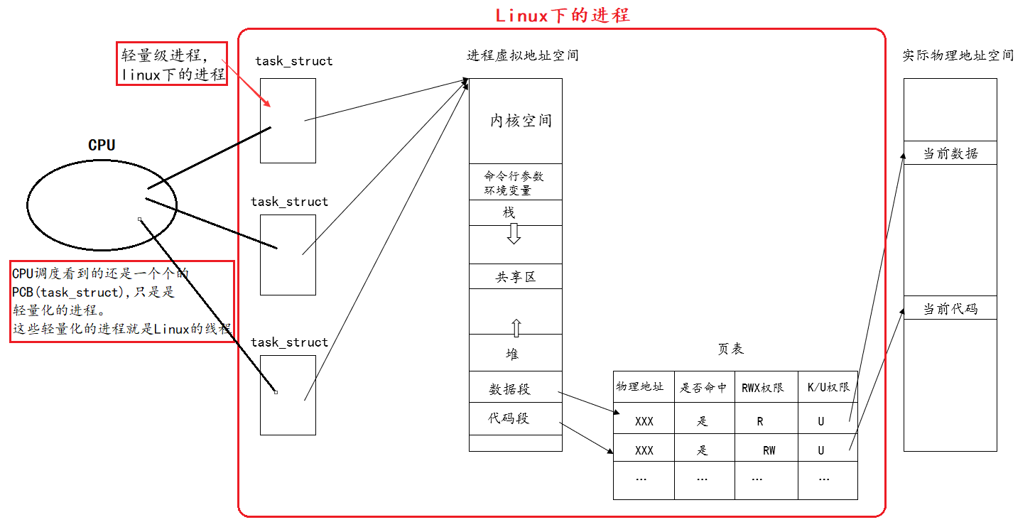由于在Linux中没有真正意义上的线程,是用进程来模拟的,所以CPU调度一个线程,看到的还是一个PCB(task_struct)。但是要比传统的进程更加轻量化。task_struct表示的还是进程控制块。