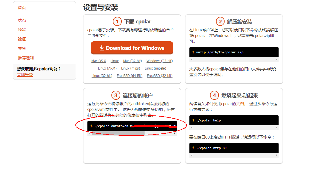3.也可以通过cpolar,运行dos 命令(cpolar)执行如下认证操作,然后在你自己的端口上启动http隧道。