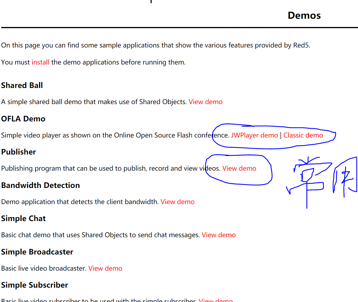 配置好运行环境后,点击red5.bat即可启动,在浏览器地址栏输入http://localhost:5080/出现如下界面则说明配置成功。