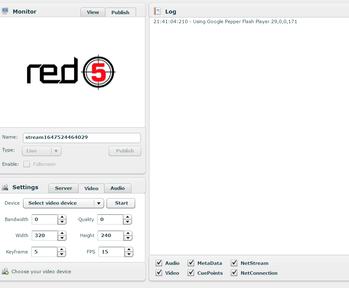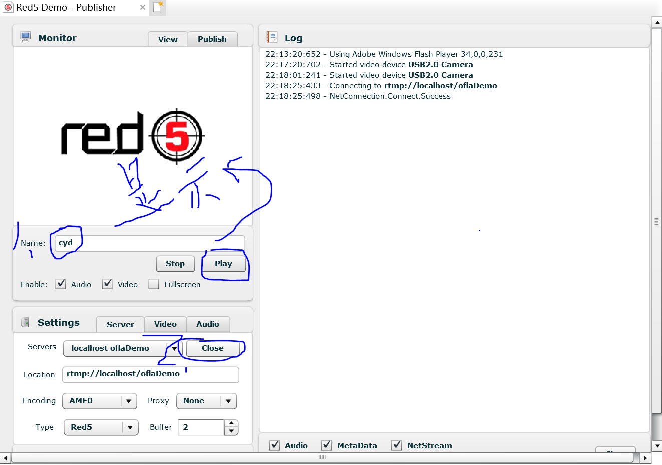 2、切换到video界面,设置跟sever一致的名称(Name),然后点击Publsih按钮,即可发布成功。(如下图2所示)