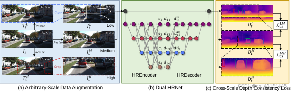 2、开发了一种双高分辨率网络,具有多尺度特征融合,使用新的跨尺度深度一致性损失训练。