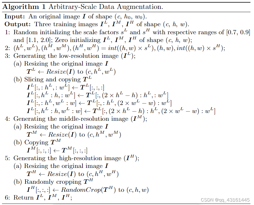 对于形状为 (c, h0, w0) 的单个原始图像 I,我们首先获得三个不同分辨率的图像 (T L, T M 和 T H)通过调整大小操作。 T M 的分辨率固定为 (h, w ),表示中间刻度。 T L 和 T H 的分辨率在连续范围内随机变化,分别由比例因子 sL 和 sH 控制。 sL 和 sH 的范围分别为 [0.7, 0.9] 和 [1.1, 2.0]。通过图像拼接的方式从 T L 生成一个低比例图像 IL,T M 直接视为中间比例图像 IM ,从高分辨率图像 IH通过 RandomCrop得到TH。(三者分辨率相同)(在本文中,(c, h0, w0) 是 (3, 375, 1242), (c, h, w ) 是 (3, 192, 640))(细节参照图2和算法1)