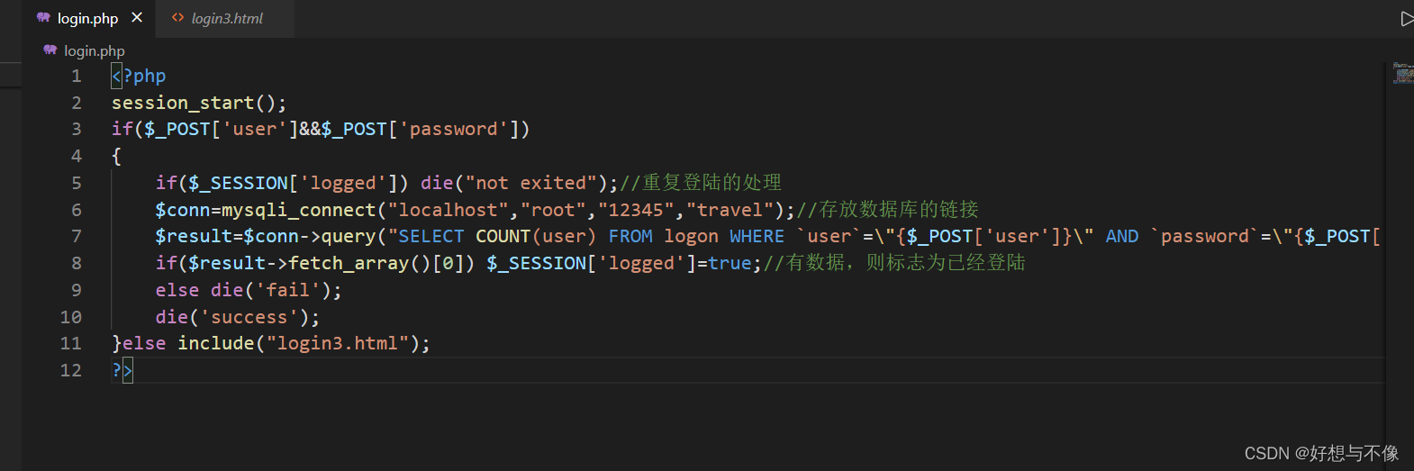 if($result->fetch_array()[0]) $_SESSION['logged']=true;//比较,如果result里不为空,真名有查询到数据,就说明该用户存在。