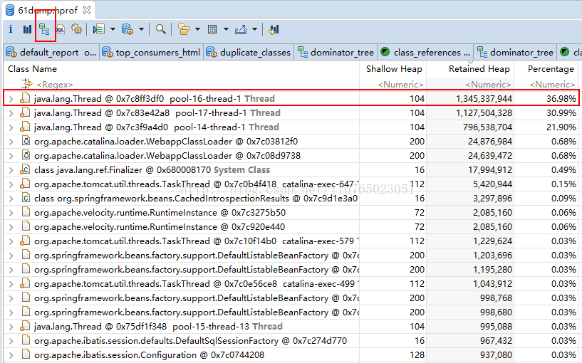 我们想看看JDBC对象里面对方了那些数据。接下来我们打开《open dominator tree for entire heap》这个视图: