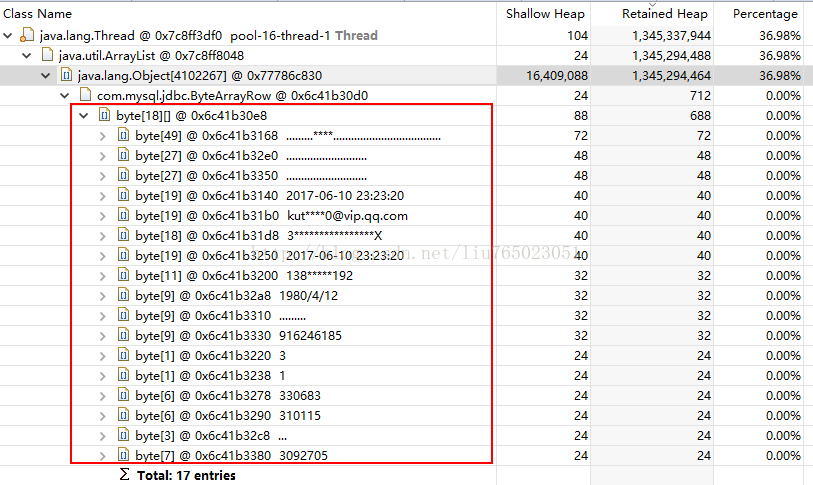 这里的数据,是我们的一张用户表的数据。所以这就可以得出结论:一个线程内,一个list内存放了大量从数据库中获取的用户对象!