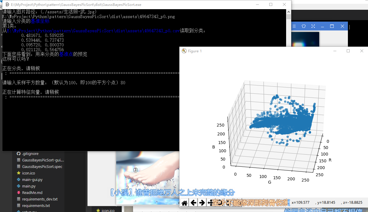然后开始对图片分类,这里我只取了 RGB 作为特征值,忽略了 Alpha 通道,一方面很多图片本身就是没有透明度的,另一方面只有 3 个坐标轴也方便后面的特征空间的绘制,不然四维特征空间怎么画?难不成用时间轴代替 Alpha 轴做成动画?(手动滑稽)